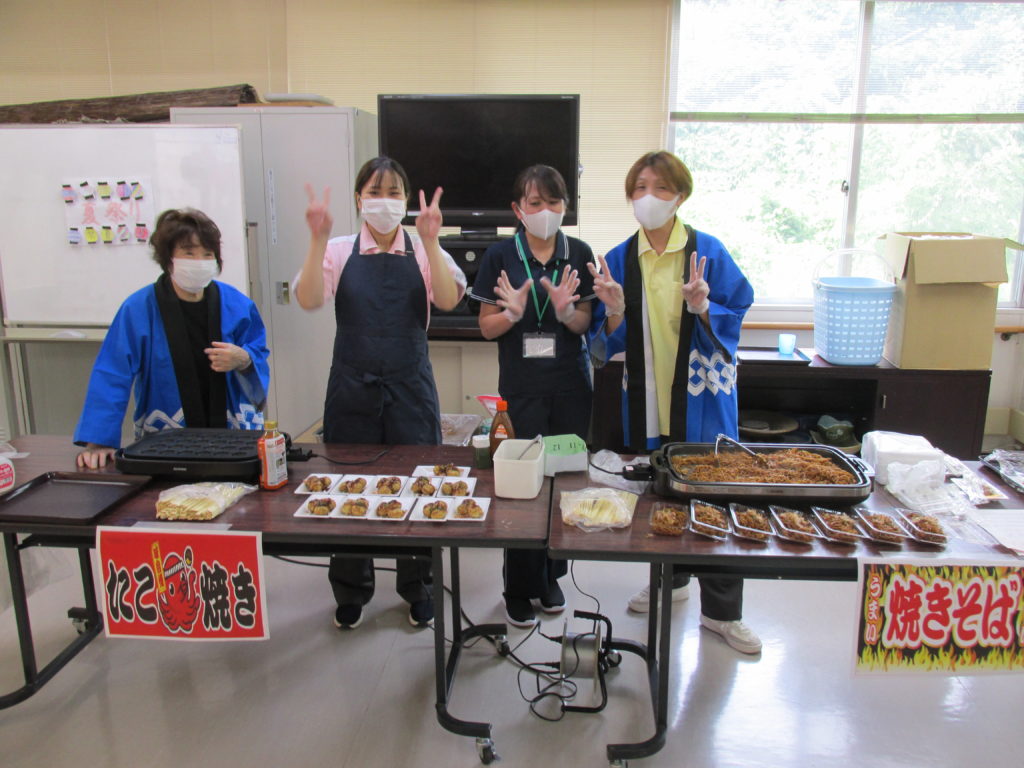 いつも美味しい食事を提供してくださる日清医療食品様にも協力していただき、熱々のたこ焼きと焼きそばを準備しました。美味しそうな匂いが会場全体に広がり食欲をそそられます・・・。